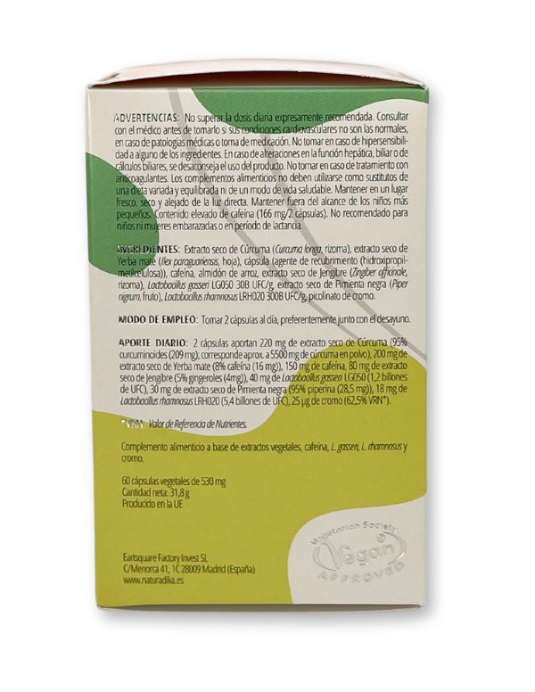 Consejos de utilización:Toma 2 cápsulas al día, preferiblemente con el desayuno.Composición del producto:Por dosis diaria recomendada de 2 cápsulas Magrifit Piperine proporciona: Extracto seco de Cúrcuma (220 mg - 95% curcuminoides; equiv. aprox. a 5500 mg de cúrcuma en polvo), Extracto seco de Yerba Mate (200 mg - 8% cafeína), Cafeína (150 mg), Extracto seco de Jengibre (80 mg - 5% gineroles), Lactobacillus gasseri LG050 (40 mg - 1,2 billones de UFC), Lactobacillus rhamnosus LRH020 (18 mg - 5,4 billones de UFC), Pimienta Negra extracto seco (30 mg - 95% piperina), Cromo (25 μg - 62,5%*). *VRN: Valor de Referencia de Nutrientes