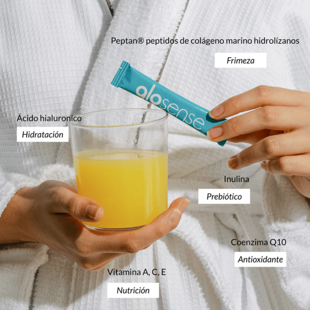 Péptidos de colágeno hidrolizado (fish), inulina, acidificante (ácido cítrico), ácido hialurónico, aroma natural, vitamina C (ácido L-ascórbico), coenzima Q10, vitamina E (acetato de DL-alfa-tocoferilo), edulcorante (glucósidos de esteviol de Stevia rebaudiana), vitamina A (acetato de retinilo), colorante (beta-caroteno).