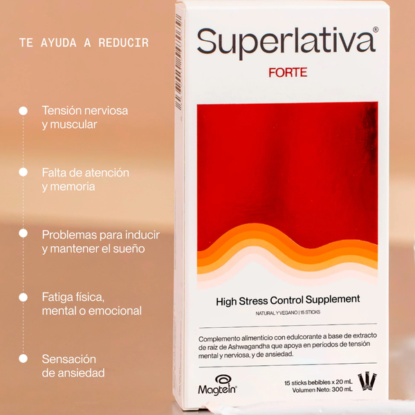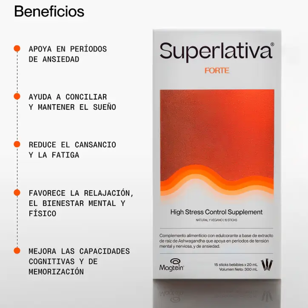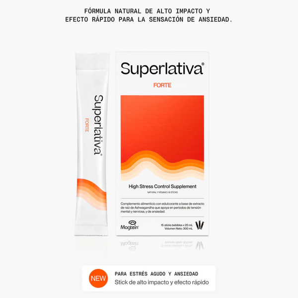 Superlativa Forte es un complemento nutricional en formato stick líquido que ayuda a gestionar el estrés, la ansiedad y la tensión nerviosa. Su fórmula con extractos adaptógenos y acción ansiolítica ofrece calma sin sedación, apoyando el equilibrio físico y mental.