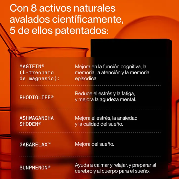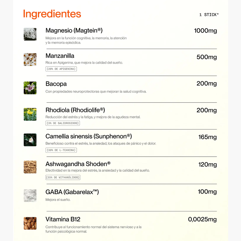 Agua, zumo de grosella, sirope de agave, humectante (glicerina), Magtein® (treonato de magnesio), extracto seco de Matricaria recutita (20% apigenina), estabilizante (ciclodextrina), aromas, extracto seco de Bacopa monnieri (10:1), Rhodiolife® (extracto seco de Rhodiola rosea, 3% salidrosidos), Sunphenon® (extracto seco de Camellia sinensis, 30% L-teanina), Shoden® (extracto seco de Withania somnifera, 35% withanólidos), Gabarelax™ (ácido gamma aminobutírico), estabilizante (celulosa microcristalina), espesante (goma xantana), conservantes (sorbato de potasio, benzoato de sodio), acidulante (ácido cítrico), edulcorante (glucósidos de esteviol de estevia), cianocobalamina (vitamina B12).