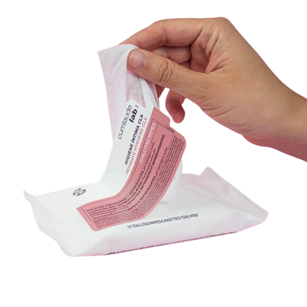 Cumlaude Lab Toallitas Higiene Íntima CLX 15 uds son toallitas limpiadoras suaves y refrescantes formuladas para la higiene diaria de la zona perianal e íntima. Elaboradas con tejido natural de origen vegetal y una solución humectante con pH fisiológico, limpian con suavidad, refrescan y ayudan a reducir el roce causado por el papel higiénico.