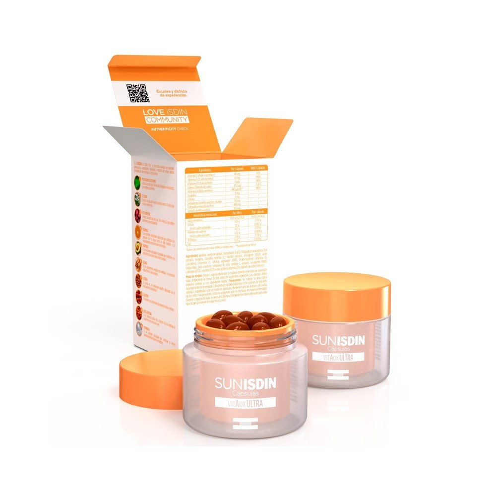 https://galileofarma.com/it/products/proteccion-solar-oral-duplo-sunisdin-capsulas-para-el-sol-30-30-capsulas 10901556166923 Duplo SunISDIN Cápsulas para el Sol 30 + 30 cápsulas SunIsdin Duplo es un complemento alimenticio con vitaminas C y E que contribuyen a la protección celular frente al daño oxidativo. Con VitAox Ultra, un innovador complejo con vitaminas antioxidantes, carotenoides, minerales y extractos de origen natural formulado por dermatólogos y nutricionistas. Los nutricosméticos son complementos alimenticios cuyos ingredientes actúan directamente sobre la piel, mejorando su estado.Ventajas del producto POLYPODIUM LEUCOTOMOS POIR + TÉ VERDE + VITIS VINIFERA L.: Extractos vegetales que contienen polifenoles. VITAMINA C + VITAMINA E + SELENIO: Contribuyen a la protección de las células frente al daño oxidativo. CAROTENOIDES (LUTEÍNA + LICOPENO + BETACAROTENO): El Betacaroteno es un precursor natural de la vitamina A. Ésta contribuye al mantenimiento normal de la piel. VITAMINA D: 100% de la dosis diaria recomendada. Contribuye al funcionamiento normal del sistema inmunitario. Consejos de utilizaciónTomar 1 cápsula de SunISDIN diaria por la mañana durante el periodo de exposición solar, empezando al menos 15 días antes de la primera exposición. Las cápsulas deben ingerirse enteras y con abundante líquido.Composición del productoGelatina, aceite de girasol, humectante (E 422), extracto de Polypodium leucotomos Poir, licopeno, extracto de Camellia sinensis (L.) Kuntze, emulgente (E 322), ácido L-ascórbico (vitamina C), luteína, espesante (E 341), D-alfa-tocoferol (vitamina E), triglicéridos, beta-caroteno (vitamina A), extracto de Vitis vinifera L., emulgente (E 901), colorante (E 172), colorante (E 171), colecalciferol (vitamina D3), selenito de sodio (selenio).Advertencias y precaucionesNo superar la dosis diaria expresamente recomendada. Este producto no debe utilizarse como sustituto de una dieta variada y equilibrada ni de un modo de vida sano. Mantener fuera del alcance y de la vista de los niños más pequeños. Evitar la exposición solar en las horas de máxima intensidad. Durante la exposición solar es necesario utilizar un fotoprotector tópico adecuado para cada tipo de piel. Conservar en lugar fresco y seco. https://galileofarma.com/cdn/shop/files/12137_ef31679d-6c05-4721-9ebe-00418efd93ca.jpg?crop=center&height=300&v=1776260011&width=300 https://galileofarma.com/cdn/shop/files/12137_ef31679d-6c05-4721-9ebe-00418efd93ca.jpg?crop=center&height=100&v=1776260011&width=100 60.55 60.55 0.0 0.0 instock Armonia Escludi dai codici EXTRA Filtri solari Isdina iva10 Nutrizione Orale Prodotti Dermocosmetici Productos Solares de Farmacia Agotado temporalmente FALTAN Imagenes Harmony Inicio iva10 Nutrición Productos de Dermocosmética Protección solar Protección solar oral Solares de farmacia Isdin 1776299262000