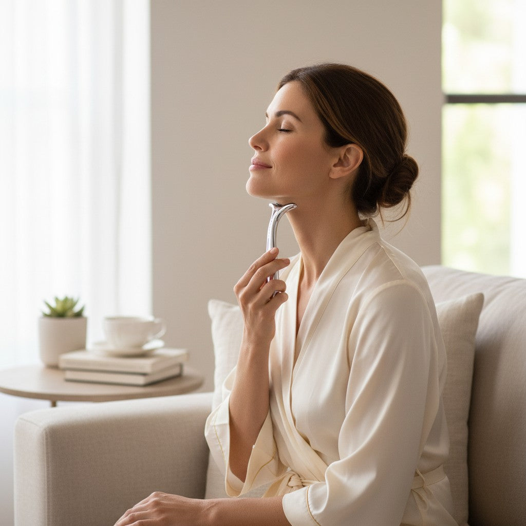 Il massaggiatore Mica aiuta a mantenere collo e décolleté idratati, prevenendo la secchezza e mantenendo un aspetto sano. Favorisce una migliore penetrazione di creme e sieri, migliorando l'assorbimento dei loro nutrienti. Con un uso regolare, può aiutare a levigare linee sottili e rughe, donando a collo e décolleté un aspetto più giovane e rivitalizzato.